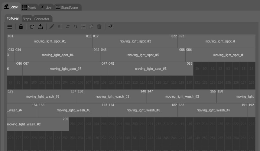 Select fixtures from the built-in library and place them in the 512-channel DMX grid for quick setup.