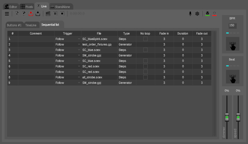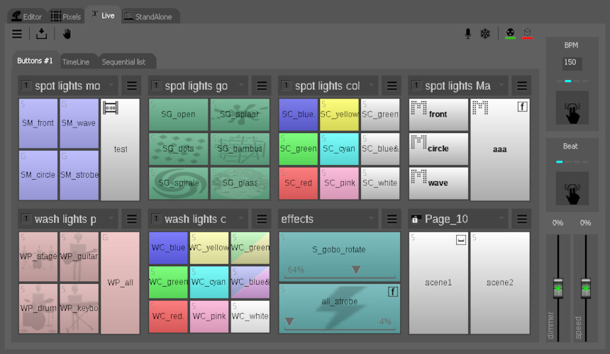 Organize scenes in a cue list and trigger them in sequence with a simple “Go” button.