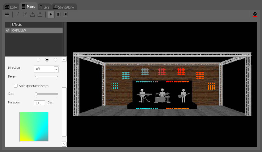 Create rainbow, scrolling text, or animated image effects and apply them across multiple fixtures.